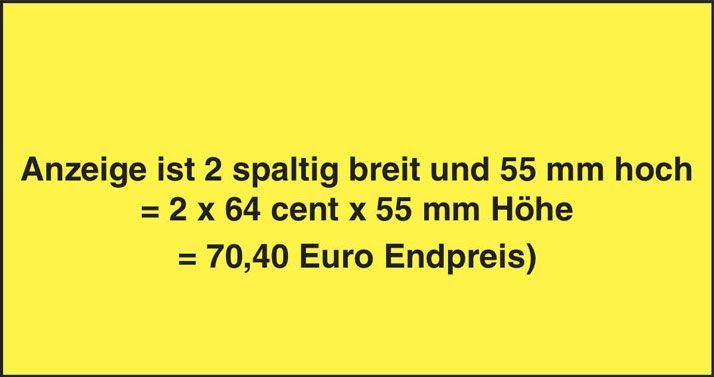 Anzeige ist 2 spaltig breit und 55 mm hoch = 2 x 64 cent x 55 mm Höhe = 70,40 Euro Endpreis)